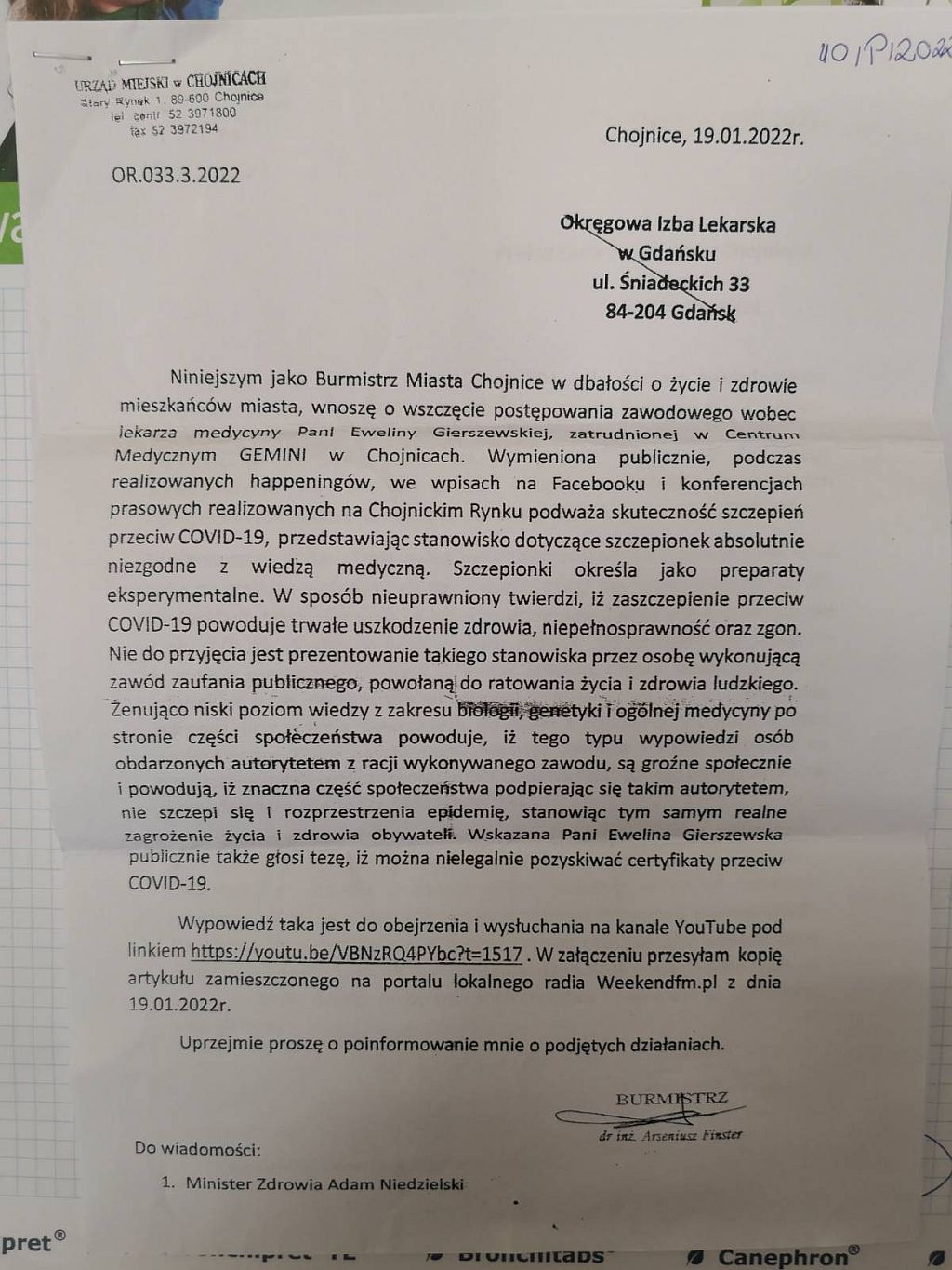 Burmistrz Miasta Chojnice napisał donosy do Okręgowej Izby Lekarskiej w Gdańsku oraz do Prokuratury Rejonowej w Chojnicach w których sugeruje m.in. jakoby pani dr Ewelina Girszewska podważała skuteczność szczepionek na Covid-19 i namawiała do nieszczepienia się, doniesienia swoje argumentuje "wiedzą medyczną" oraz "możliwym poniżeniem i utratą zaufania dla Rządu, Ministra Zdrowia i Rady Medycznej".